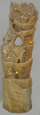 Diverse Häuser in ein Stück oder Stamm reingeschnitzt, vom Schloss bis hin zum Bergdorf.